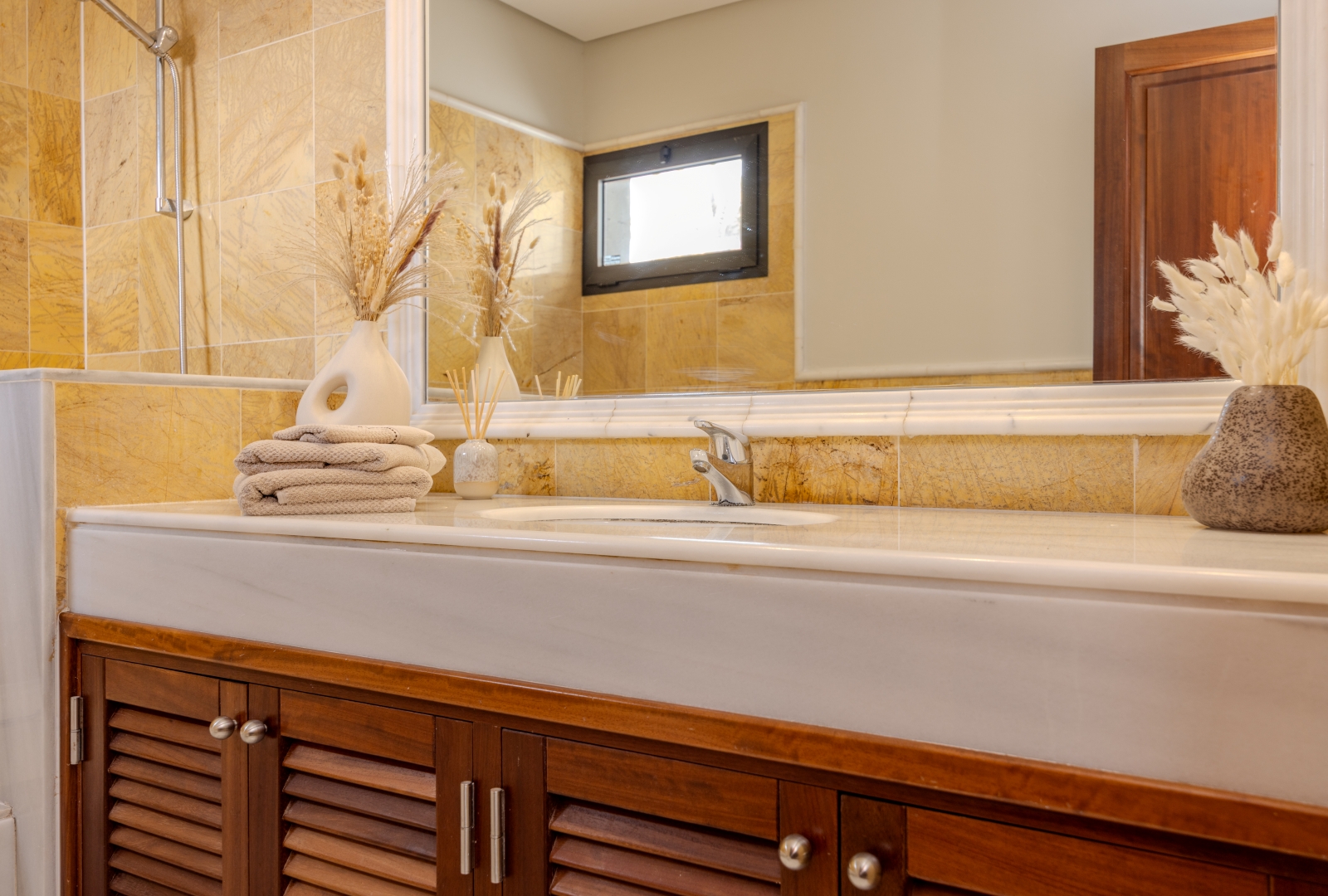 Inside, the villa reflects the renowned quality build of Faro Park and is presented to you in the highest standard. It features 2 spacious bedrooms and 2 elegant bathrooms, along with a fully fitted kitchen that flows into a bright living room. One highlight of the interior is the elegant separate dining room, designed for both family meals and hosting in impressive style. All thoughtfully furnished to showcase the quality of the villa.